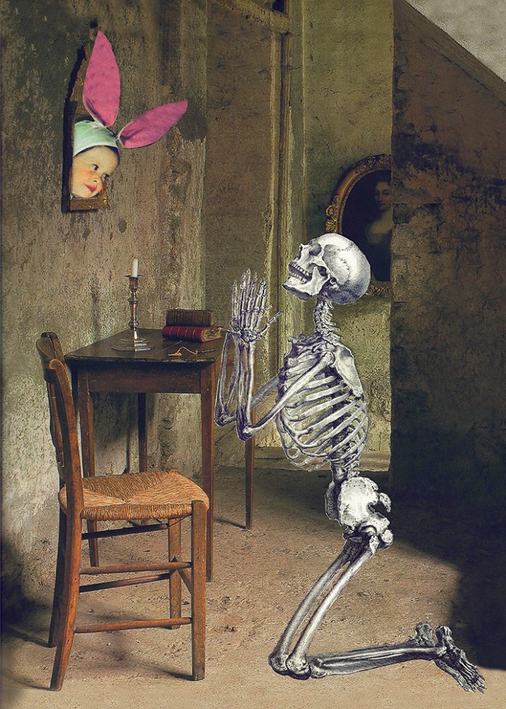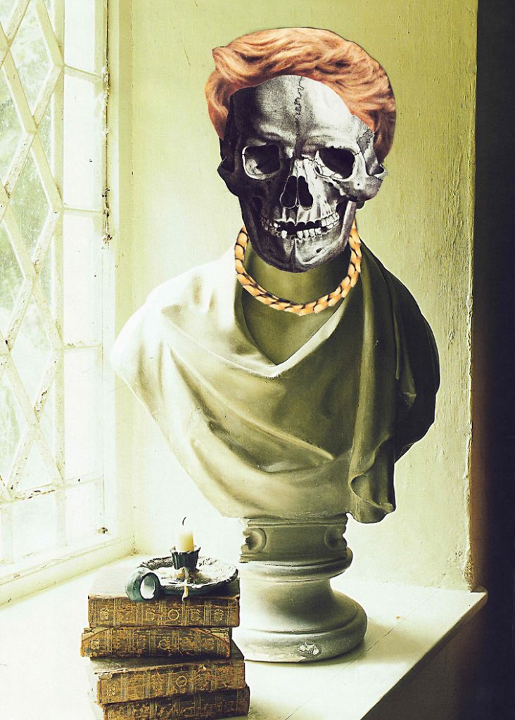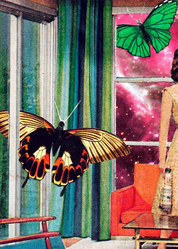 Paper collages are between 4×2″ and 10×12″. Elements are from old magazines and secondhand photography books, cut with various craft knives and tiny scissors. Digital collages are all created in Photoshop using royalty-free images.