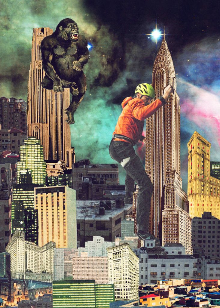 A modern climber ascends a towering skyscraper under the stars, unaware he’s caught the eye of a giant gorilla on a neighboring building.