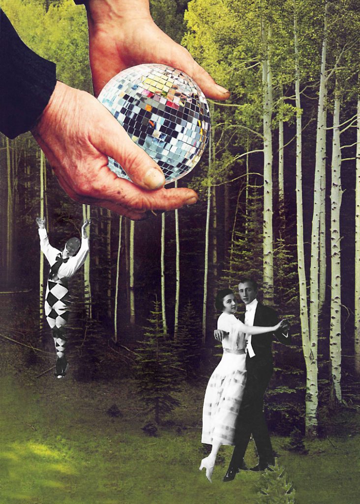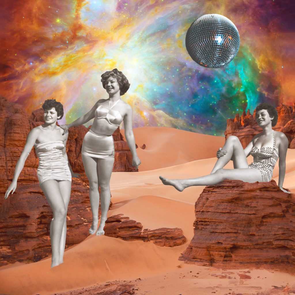 Vintage pin-up gals in swimsuits lounge in a surreal desert dreamscape where the sand and rocky dunes meet a rainbow-colored nebula in the sky. A disco ball hovers like a second moon. There's no deeper meaning to this. It was one of my first digital collages and it was just fun to create and explore the possibilities.