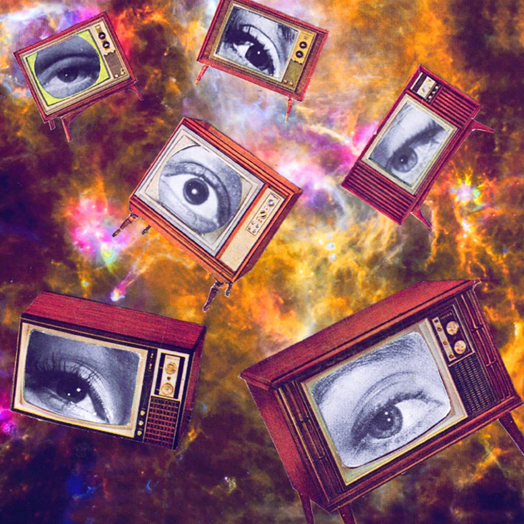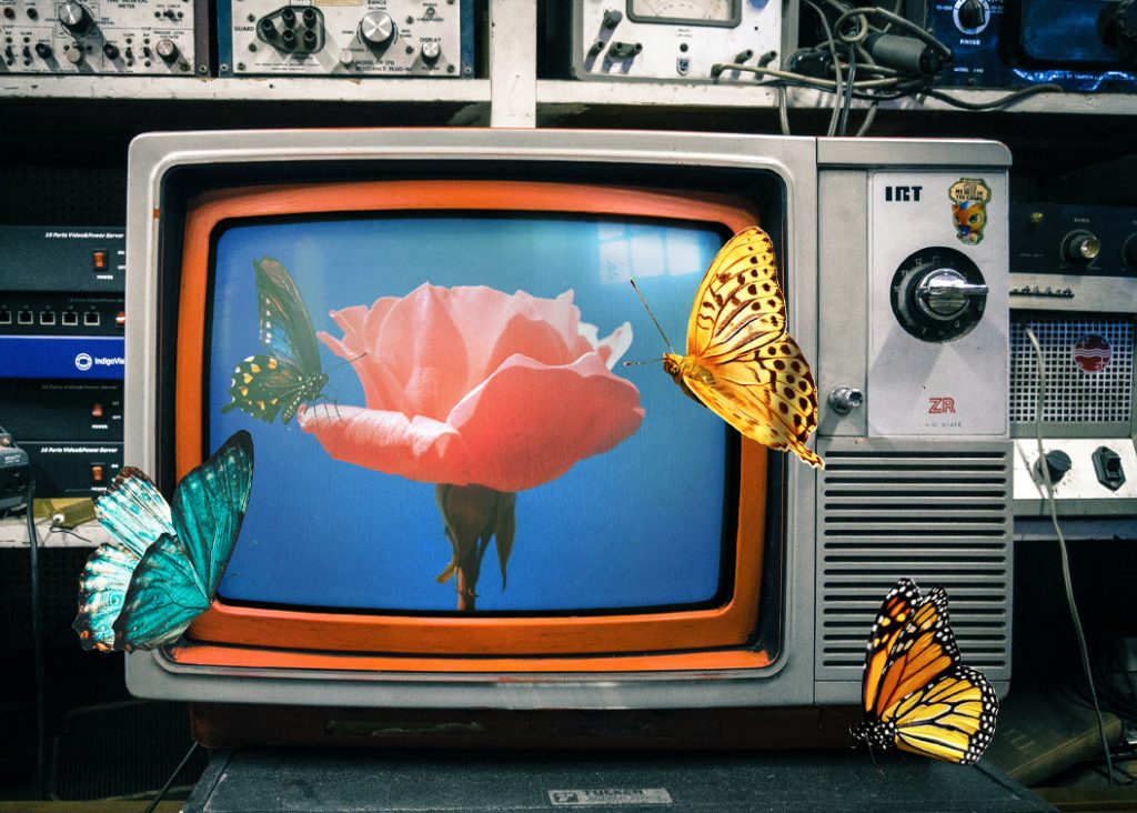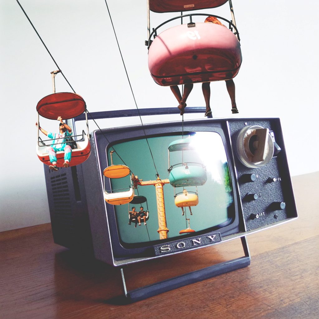 A candy-colored carnival-type skyride drifts out of a vintage TV and into open space. This is another one of those moments where the image doesn’t stay put, it breaks out of its frame and blurs the line between scene and viewer.