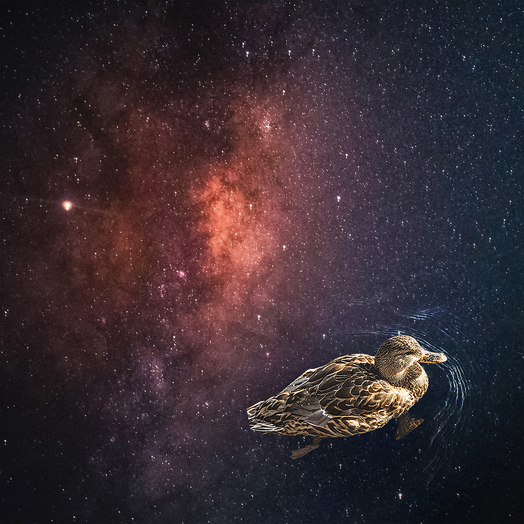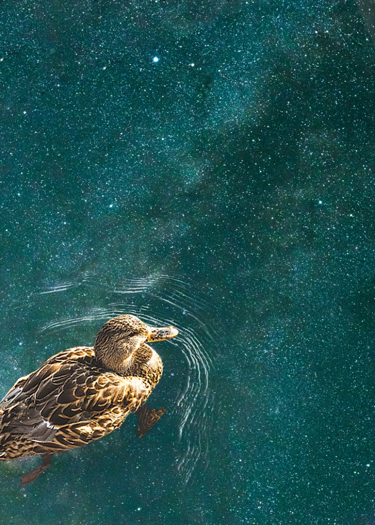 A single duck glides across a star-filled lake, barely rippling the cosmos. This piece is a nod to that calm, grounded feeling of going it alone. Free from everyone else’s schedules, open to any curiosity that might spark. Any path. Any lunch, at any time.