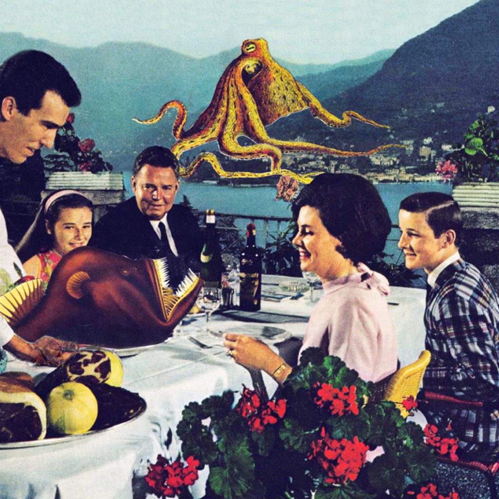 This hand-cut collage plays with mistaken identity, mirrored suspicion, and how awkward things get when everyone thinks they’re the normal one.