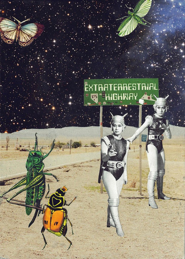 Two retro spacewomen stand under Nevada’s Extraterrestrial Highway sign, weapons raised. All around them, giant bugs throw their hands up in surprise… but nobody can really tell who startled who.