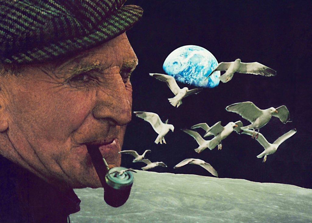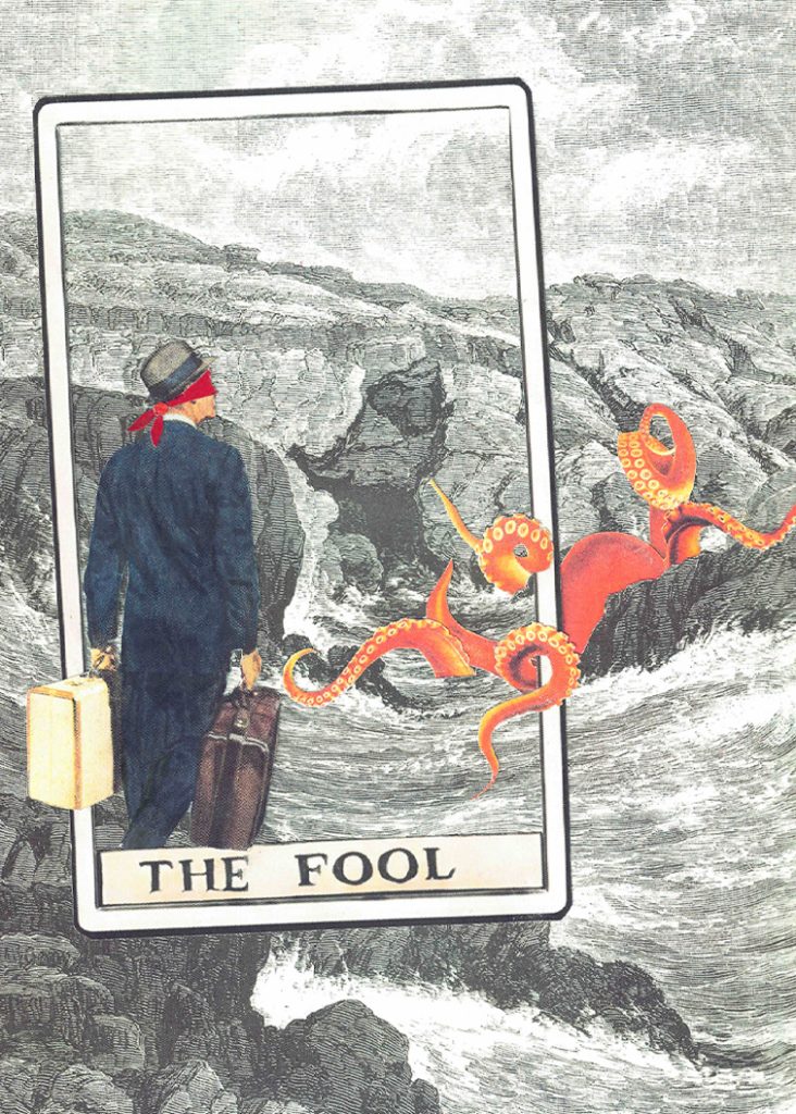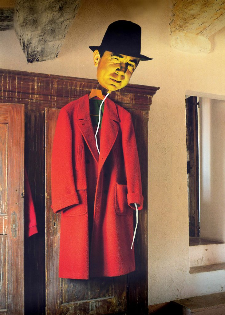 Hand-cut collage featuring a man's head floating above an empty red coat; tied like a balloon but slipping away from anything anchored in reality. It's a visual metaphor for an ego so inflated that it’s drifted from its grounded self; confident on the surface yet completely untethered.
