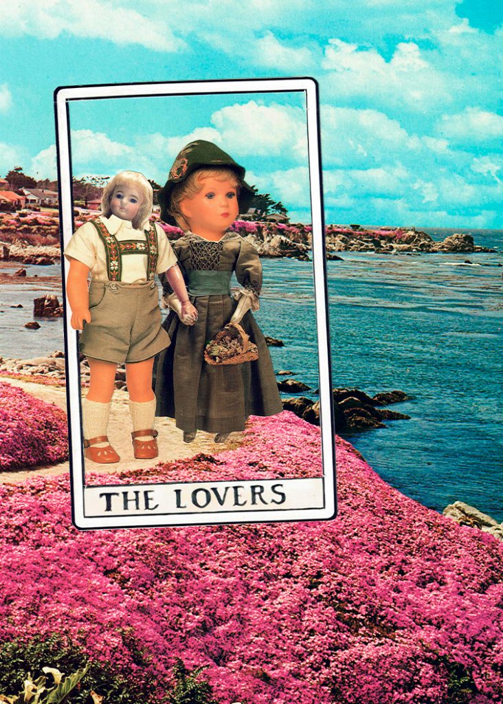 Two vintage dolls stand framed by a Lovers tarot card, holding hands against a bright seaside backdrop.